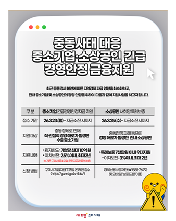 구미시가 중동 지역 정세 불안에 따른 공급망 차질과 원자재 가격 상승에 대응해 지역 중소기업과 소상공인을 위한 긴급 금융지원에 나선다.
