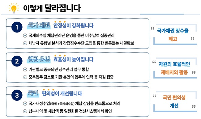 국세청은 통합징수를 통해 국세외수입 미수납액을 집중 관리하고, 국세와 국세외수입 데이터를 통합 분석함으로써 징수 효율성을 획기적으로 높일 수 있을 것으로 기대하고 있다.