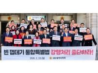 “통합 대의엔 공감 재원·의석수·의회통합 명문화 없인 동의 못 해”의원 정수 비대칭·재정 공백 지적 3월 정개특위서 전면 재논의 촉구대구시의회는 23일 시의회 청사에서 대구경북 행정통합 졸속 추진을 규탄하는 성명서를 발표하고, 재원 보장과 의석수 균형, 의회 통합 방식이 법률에 명확히 담기지 않은 통합에는 동의할 수 없다고 밝혔다.이날 시의회는 “대구경북 행정통합의 대의에는 절대 공감한다”면서도 “권한 이양과 재정 특례가 빠지고, 의원 정수 비대칭을 방치한 채 추진되는 졸속 통합은 받아들일 수 없다”고 분명히 했다. 특히 …