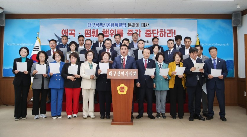 한편 대구시의회는 대구경북신공항이 성공하는 날까지 함께 힘을 모으고 앞장서 최선을 다할 것을 대구,경북민 앞에 약속하는 것을 끝으로 이날 성명을 마무리했다.