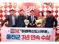 TV조선 주최 K-도시(미래혁신도시) 부문 수상… 원자력수소·맞춤형 복지 성과 주목울진군이 ‘2026 K-브랜드 어워즈’에서 3년 연속 미래혁신도시 부문 대상을 수상하며 지속 가능한 지역발전 모델을 다시 한번 입증했다.울진군은 25일 서울 더 플라자호텔에서 열린 시상식에서 TV조선이 주최한 ‘2026 K-브랜드 어워즈’ K-도시(미래혁신도시) 부문 대상을 수상했다고 밝혔다.‘K-브랜드 어워즈’는 한국을 대표하는 우수 브랜드의 가치를 조명하고, 국가 경제 발전에 기여한 기업·기관·콘텐츠를 선정해 수여하는 상이다.울진군은 울진형 복지체…