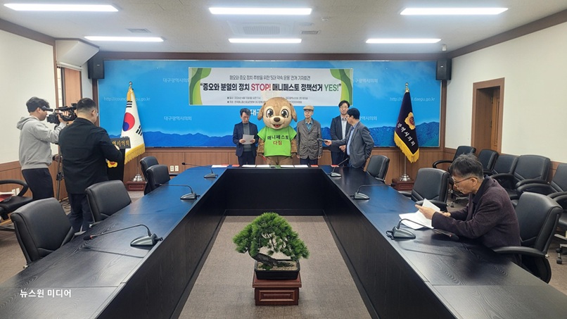 대구시의회 회의실에서 13일 한국매니페스토실천본부가 ‘혐오와 증오 정치 추방을 위한 5대 약속 운동’ 전개 기자회견을 열고 정책 중심의 선거문화 정착을 촉구했다.